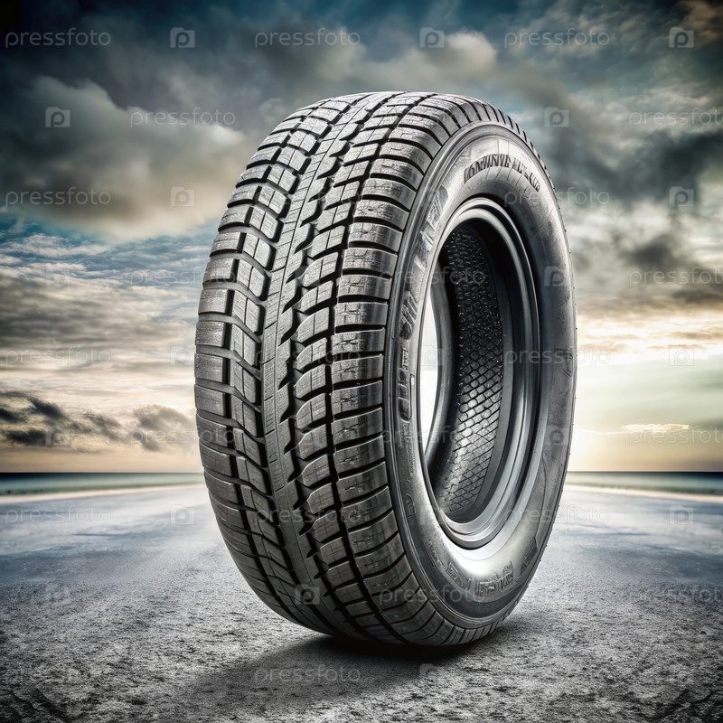 Близкий снимок шины на пустой дороге в сумерки с драматическим небом