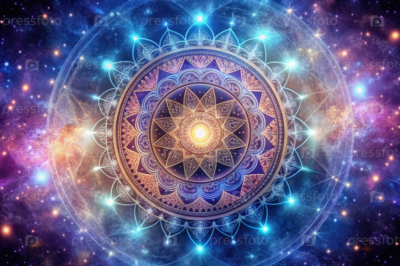 Дизайн мандалы излучает свет на фоне космического пространства