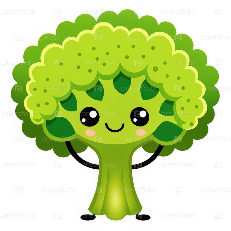 Дружелюбный мультфильмовый персонаж брокколи, стоящий весело с поднятыми руками