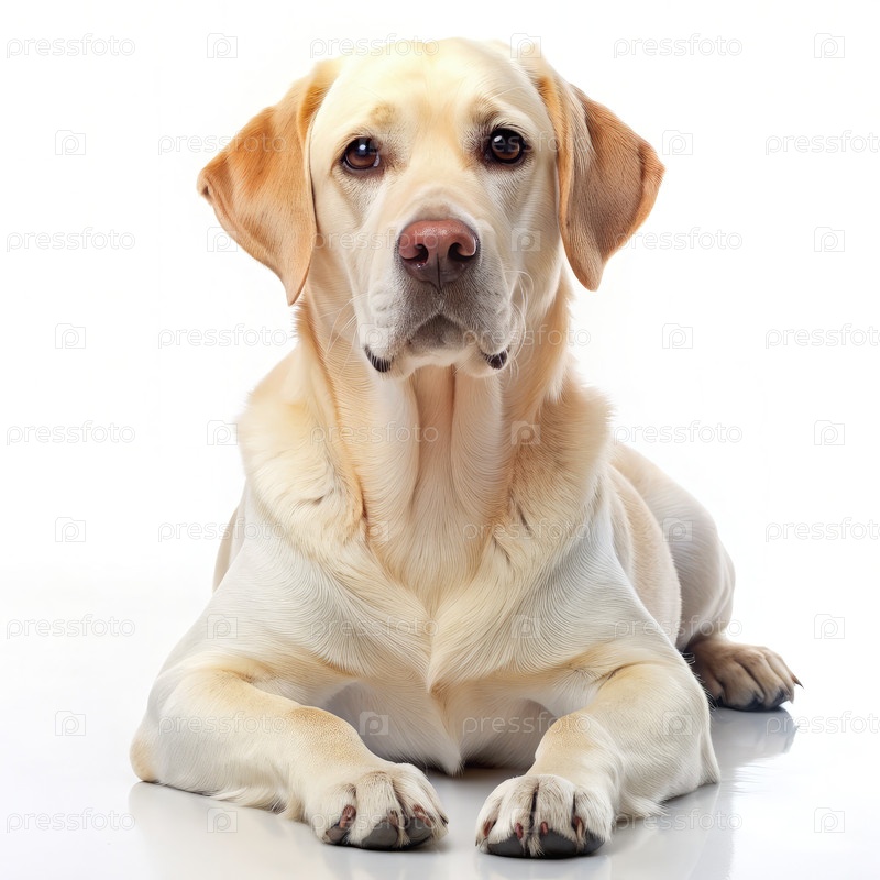 Лабрадор ретривер спокойно лежит на белом фоне в мягком освещении