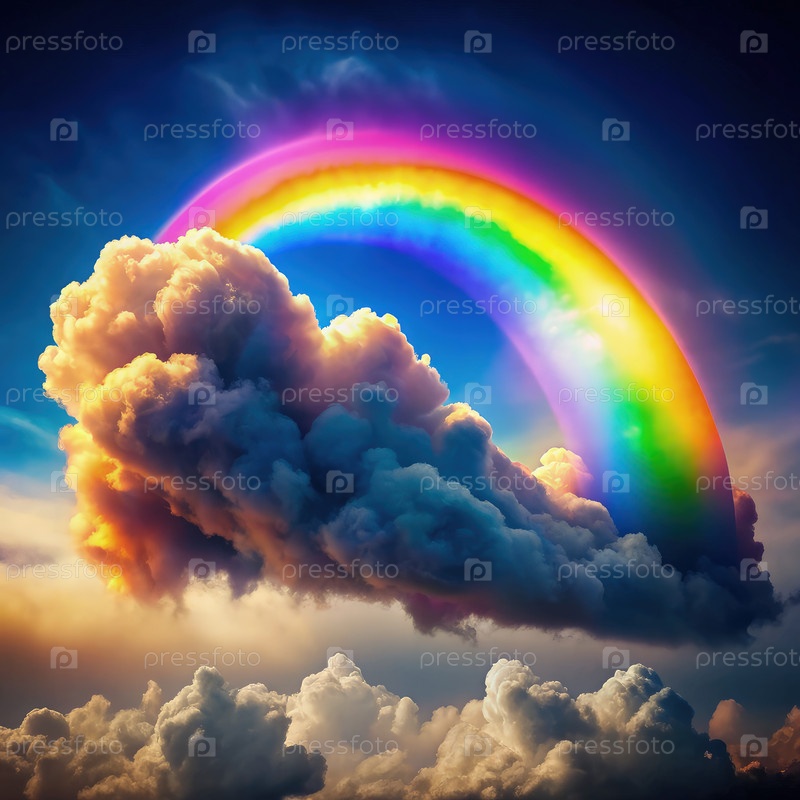 Радуга, извивающаяся над яркими облаками на закате