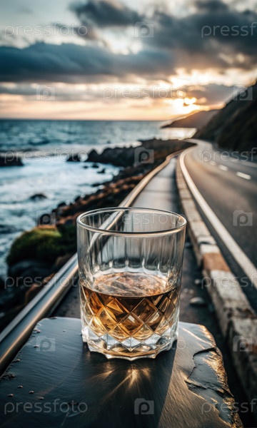 Стекло виски рядом с дорогой к океану на закате