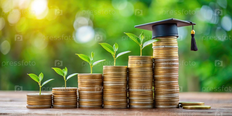 Растущее богатство и образование, представленные монетами, выпускной шапкой и растениями
