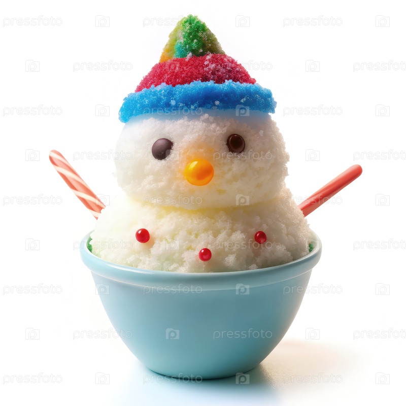 Причудливый снежный человек в форме бритого ледяного десерта в синей таре с конфетами