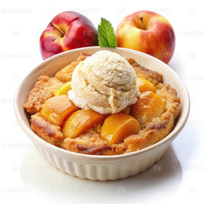 Вкусный персиковый коблер, подаваемый с ванильным мороженым и свежими персиками