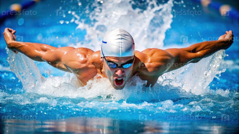 Спортивный мужчина-плаватель выполняет удар бабочки в соревновательном мероприятии на открытом бассейне во время яркого солнечного дня