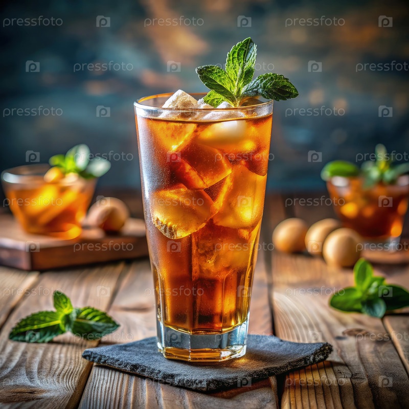 Ледяной чай подают в высоком стакане с мятой на деревянном столе