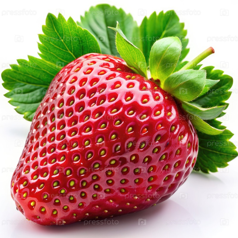 Свежесобранная клубника с ярко-зелеными листьями на белом фоне