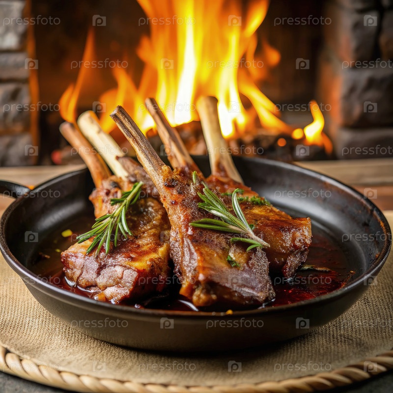 Агнцевые ребра в вкусном соусе рядом с трескающимся огнем во время еды