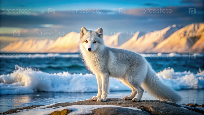 Арктическая лиса на скалистой береговой линии во время заката в спокойном прибрежном ландшафте