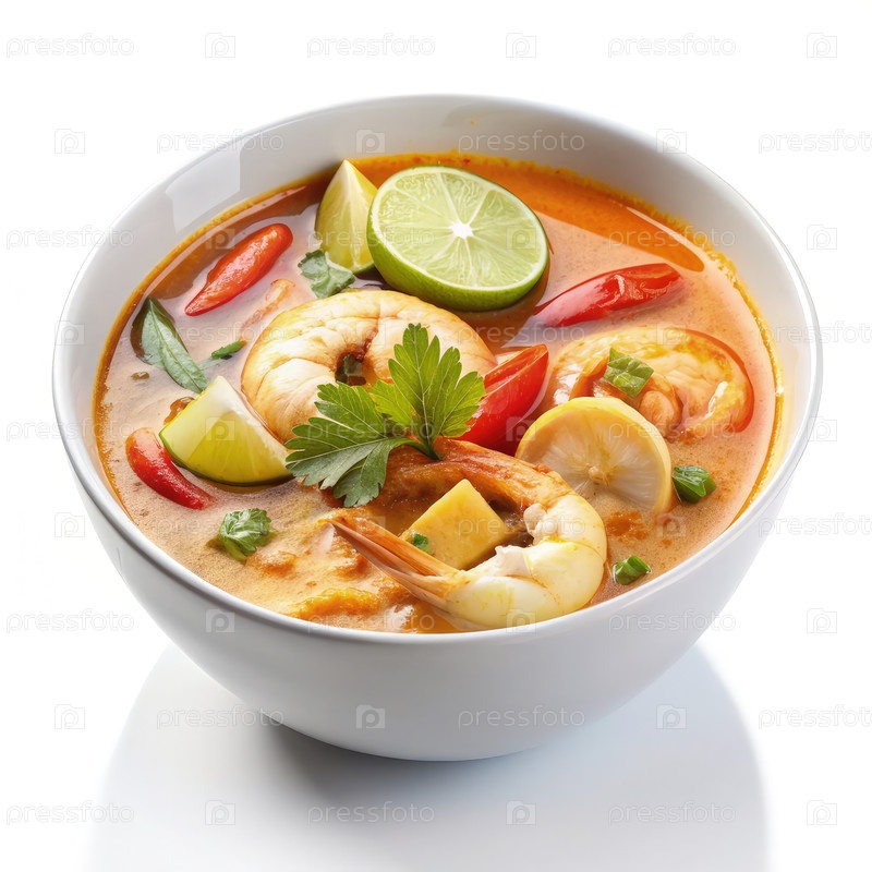 Вкусный суп том юм гонг, подаваемый в белой миске с свежими ингредиентами