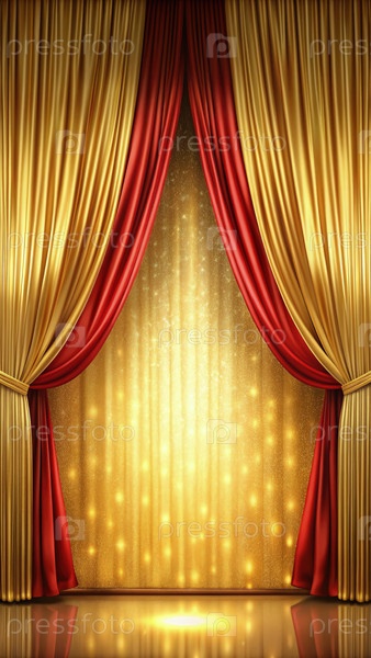 Элегантный красно-золотой занавес со сверкающим фоном для постановки сцены