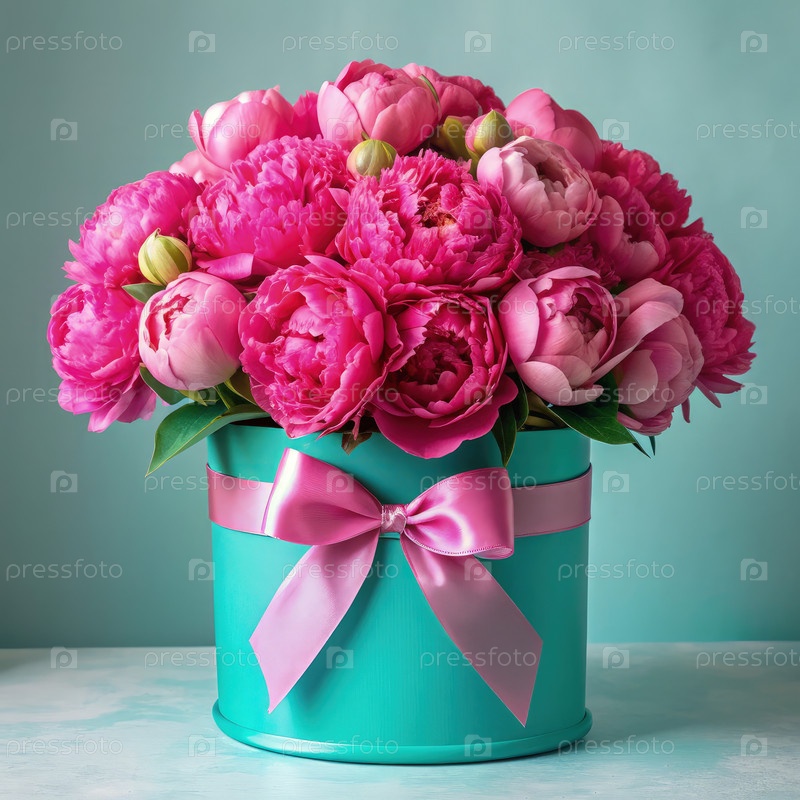 Вибрирующие горяче-розовые пионы, расположенные в декоративной зеленоватой таре