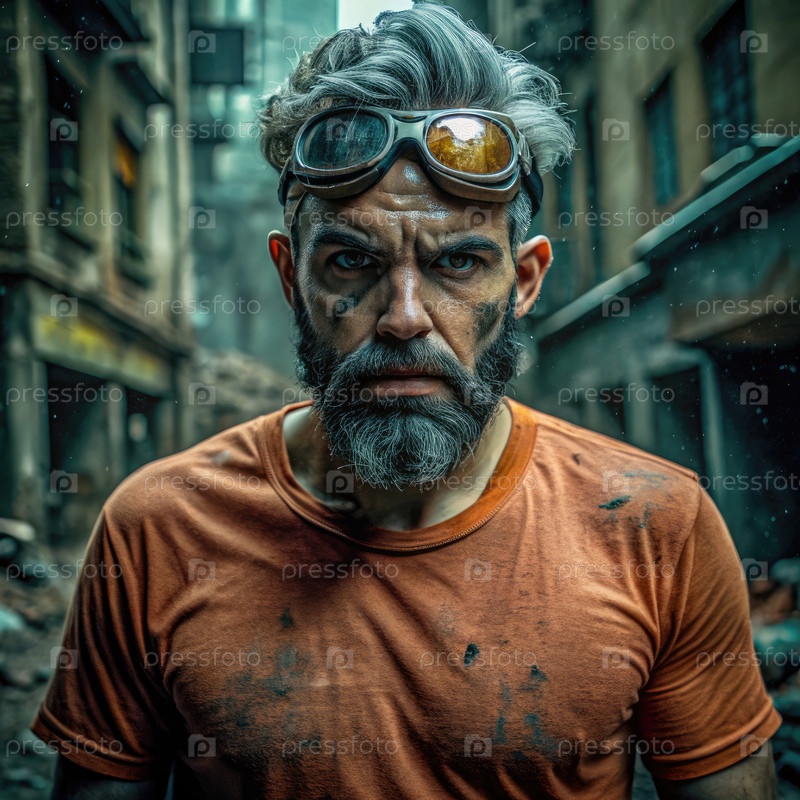 Молодой человек с седыми волосами и бородой в разрушенной городской среде, носящий очки