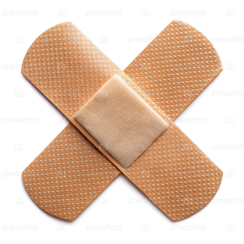 Пара клейких повязок, помещенных поперечно на белом фоне