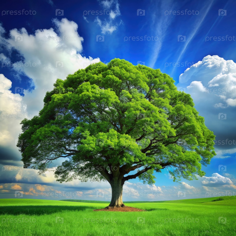 Плодоносное зеленое дерево под ярко-синим небом с пушистыми облаками в безмятежном пейзаже
