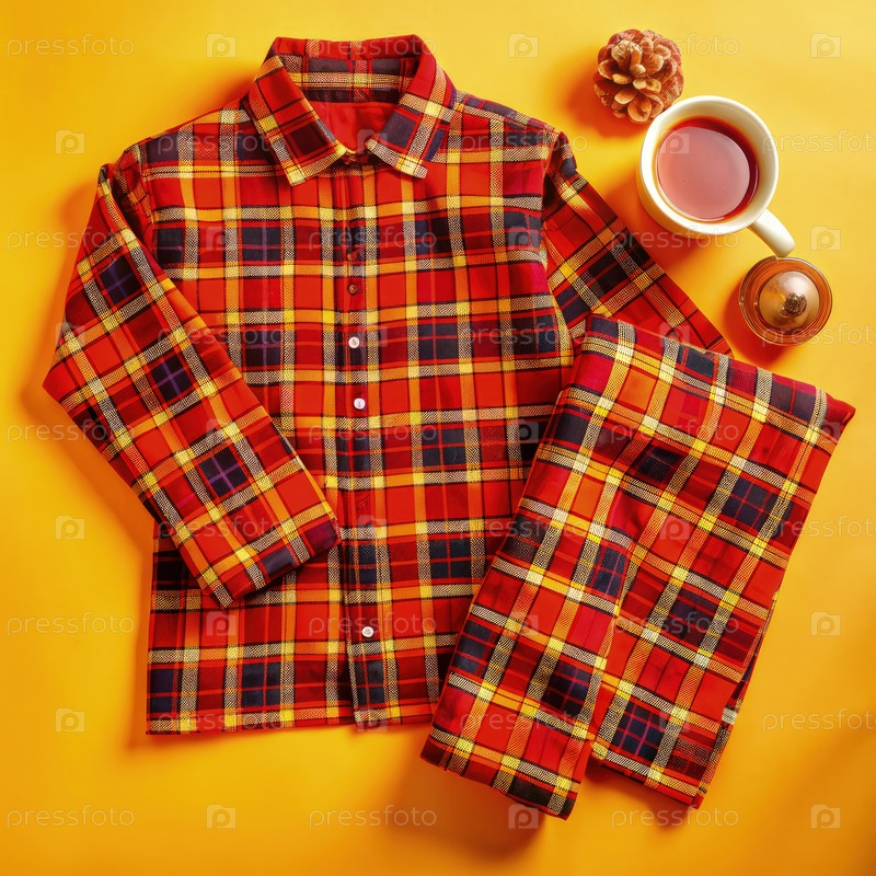 Уютный комплект фланельной пижамы расположен рядом с теплым чашечкой чая на желтом фоне