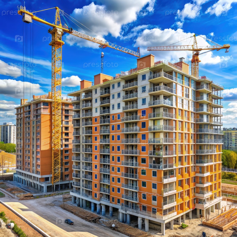 Строительство современных многоквартирных домов под голубым небом с помощью кранового оборудования в зоне городского развития. генеративный ИИ