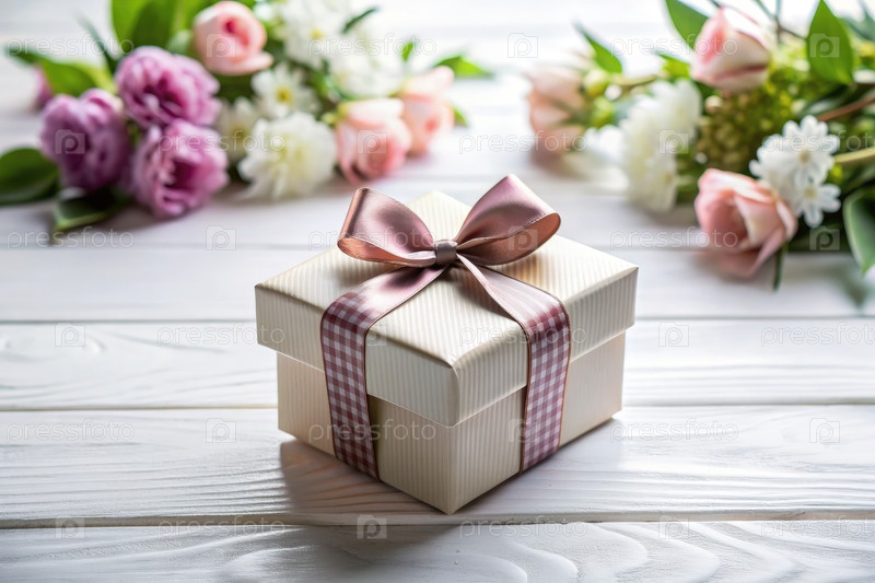 Красиво упакованная коробка для подарков на белом столе с цветочными аранжировками на заднем плане в яркий день