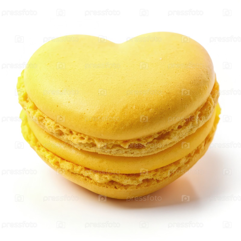 Желтый макарон в форме сердца на белом фоне готов для любителей десертов