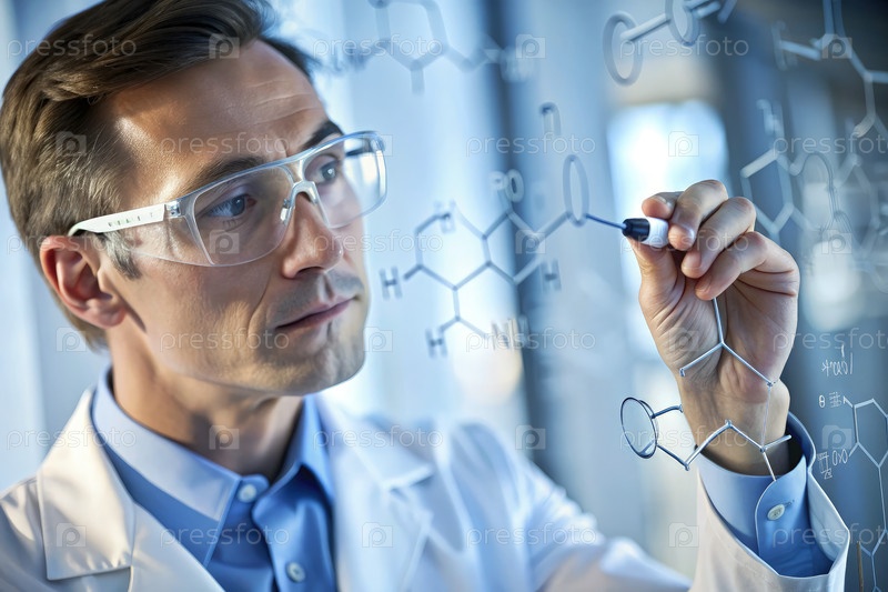 Близкий план ученого в лабораторном пальто, тщательно записывающего химические уравнения на прозрачной доске во время исследовательских часов