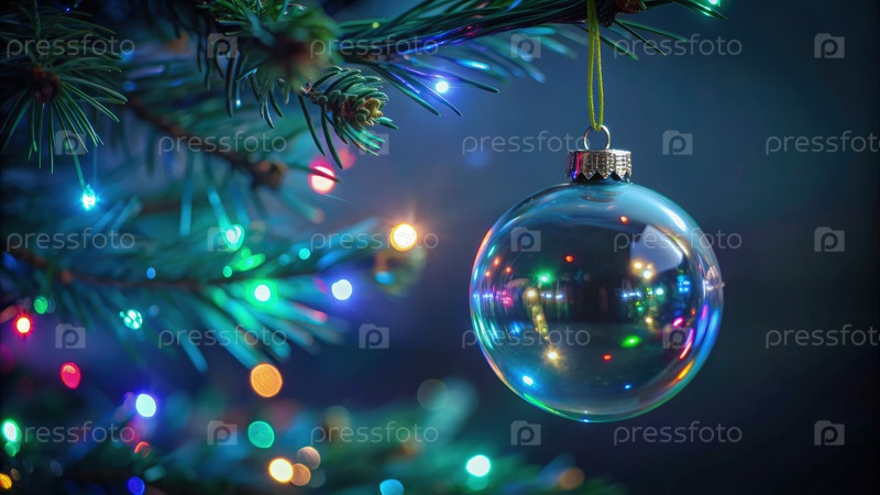 Красиво украшенная рождественская елка с прозрачным баблом, висящей среди красочных огней во время праздничного сезона