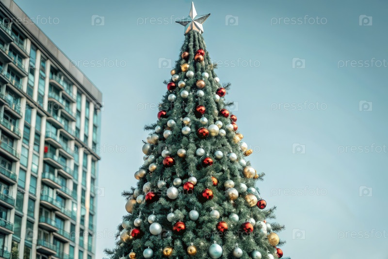 Большая праздничная рождественская елка, украшенная красочными орнаментами и звездочкой, стоящая высоко над чистым небом в городской обстановке во время праздничного сезона