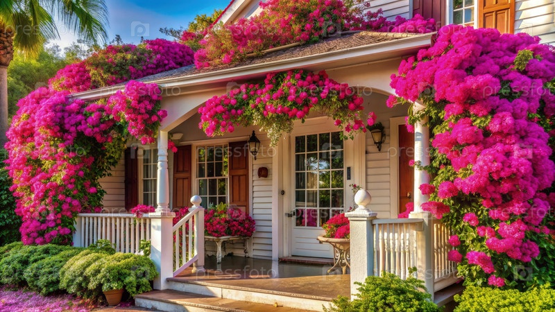 Очаровательный загородный дом, украшенный яркими бугенвильями в полном цветении во время солнечного дня