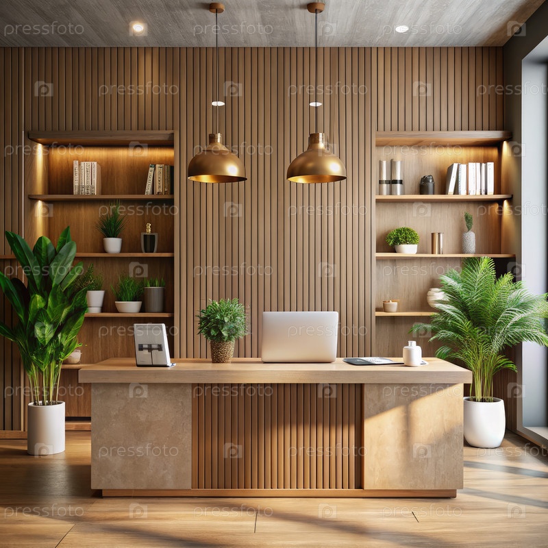Современный коричневый интерьер магазинного стола в стильном рабочем пространстве с растениями