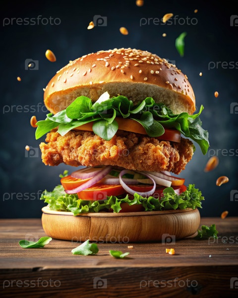 Хрустящий жареный цыпленочный бургер со свежими овощами на деревянной доске