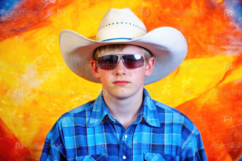 Молодой подросток надевает ковбойскую шляпу и солнцезащитные очки, демонстрируя уверенное выражение лица