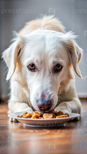 Белая собака наслаждается едой на деревянном полу в светлой комнате