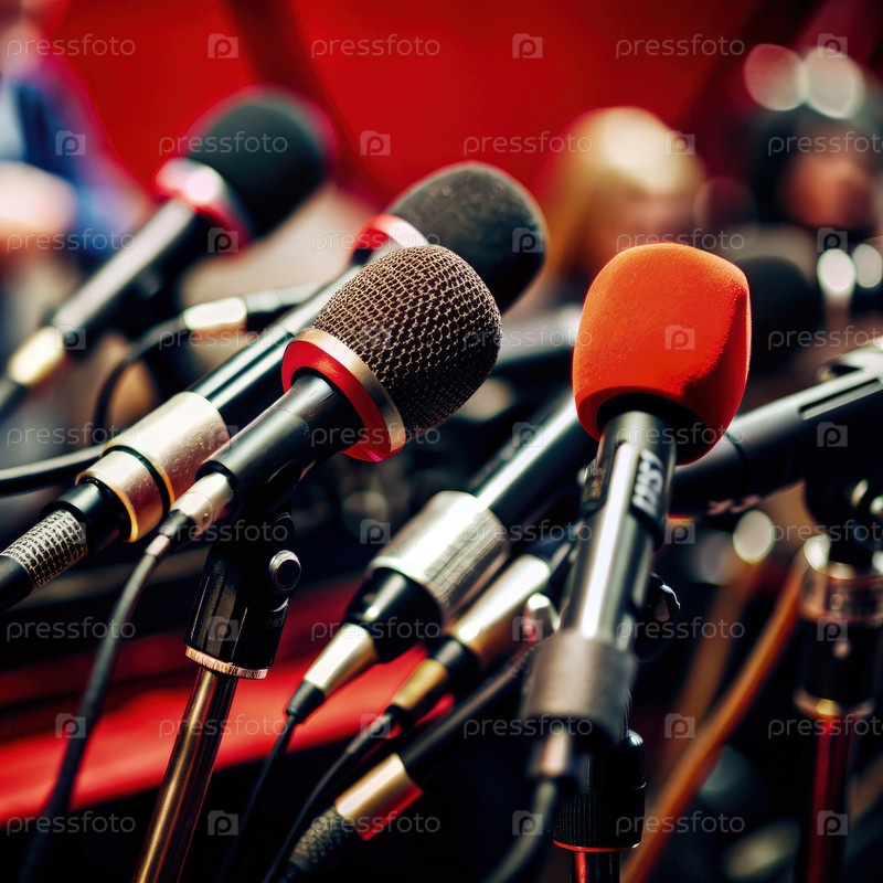 Микрофоны выстроились в очередь на пресс-конференции, фиксируя ключевые заявления докладчиков