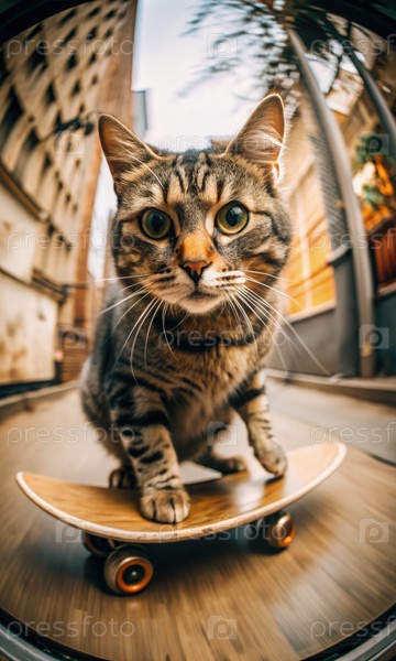 Серый пушистый кот умело катается на доске в городской зоне днем
