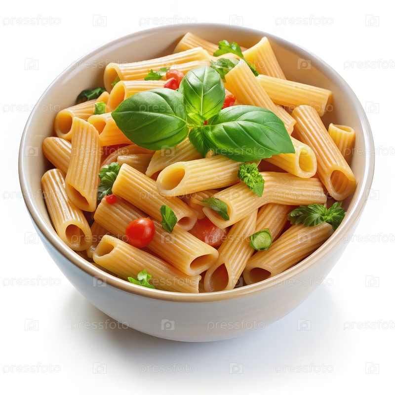 Вкусная миска макаронных изделий с свежими травами и помидорами на белом фоне