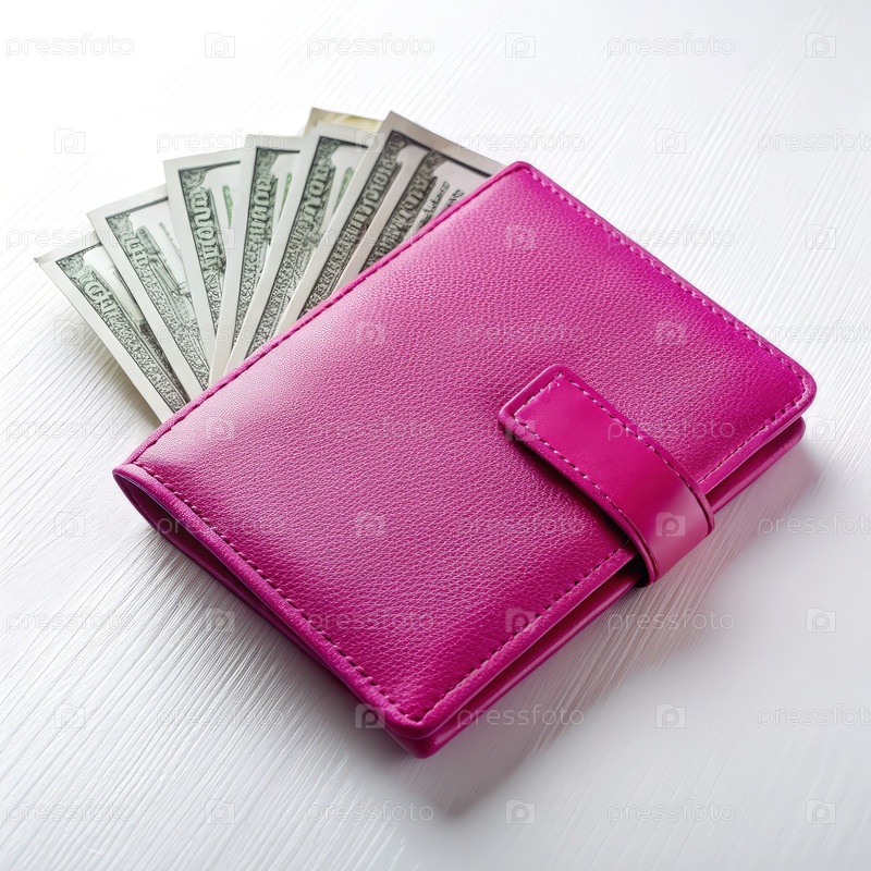 Фуксия кошелек с наличными, отображаемые на белой поверхности стола