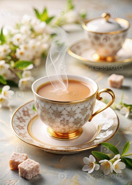 Паристый стакан молочного чая в элегантном фарфоре, сопровождаемый кубиками сахара и цветочными акцентами