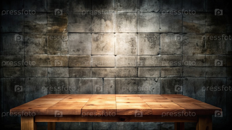 Старый деревянный стол перед размытой стенкой из бетонных блоков