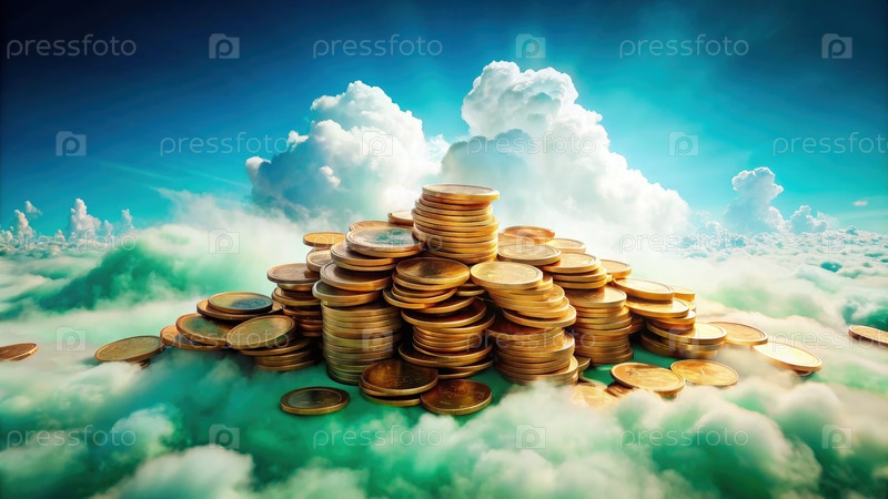 Столка мерцающих монет сидит на вершине пушистых облаков под ярким, спокойным небом и вызывает ощущение богатства и покоя в призрачном пейзаже