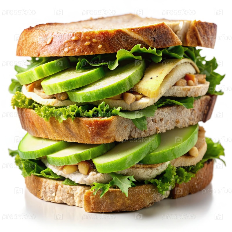 Сэндвич с курицей и авокадо со свежим зеленым на белом фоне