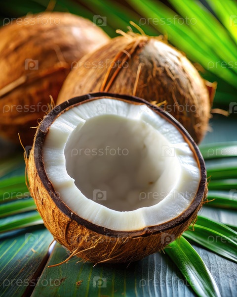 Ближайшее изображение кокоса со свежей белой плотью, окруженной тропическими листьями в естественной обстановке
