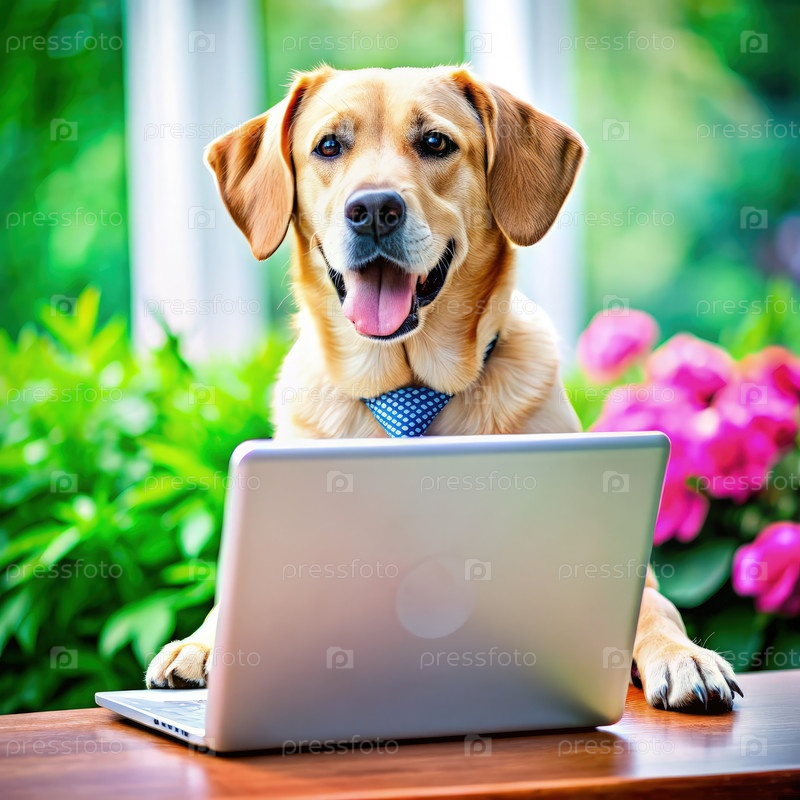Собака в галстуке работает над ноутбуком в саду в солнечный день