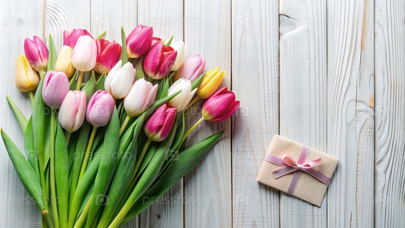 Красивые тюльпаны и поздравительная открытка на белой деревянной поверхности