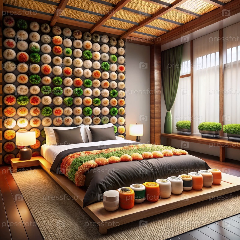 Стильная спальня с дизайном стены на тему суши в ярких цветах, современное постельное белье и декоративные растения, освещенные естественным светом днем