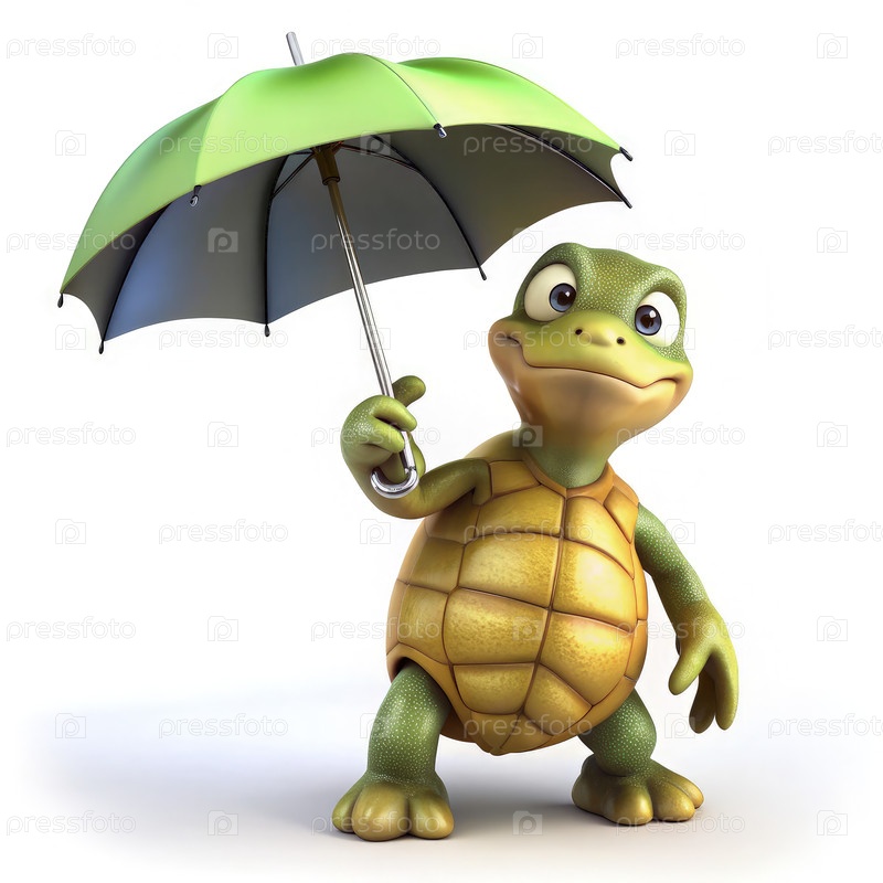 Очаровательная черепаха уверенно стоит с зеленым зонтиком, привнося радость и капризы в спокойную атмосферу на свежем воздухе в солнечный день