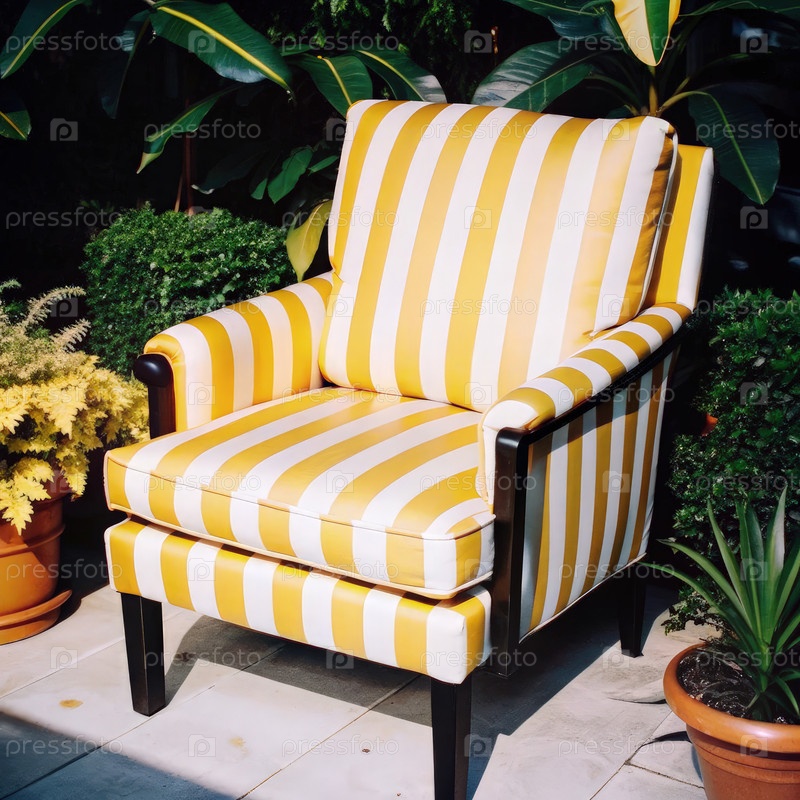 Уютный полосатый кресло в парке, окруженном пышной зеленью и горшковыми растениями