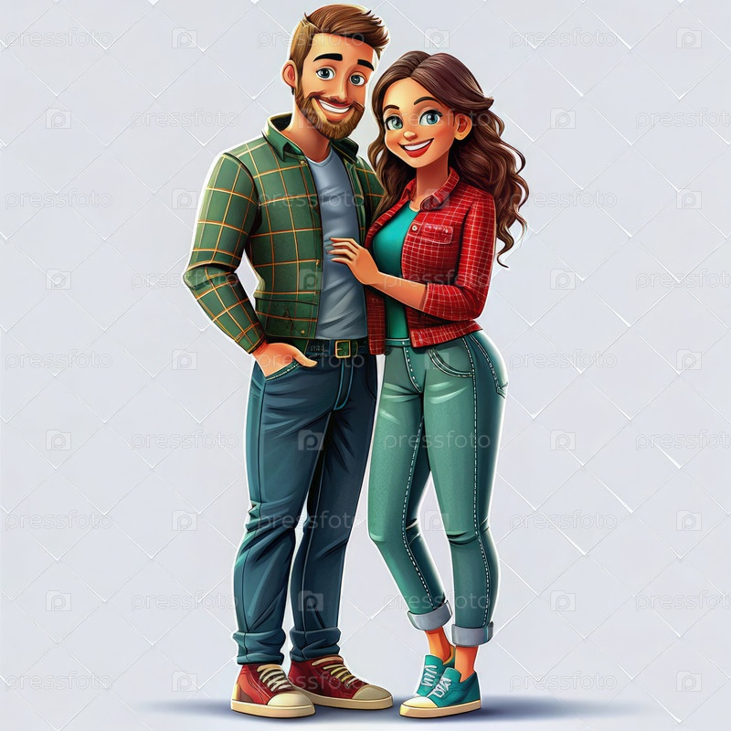 Мультипликационная пара, стоящая вместе в повседневных нарядах на белом фоне, улыбаясь и наслаждаясь компанией друг друга