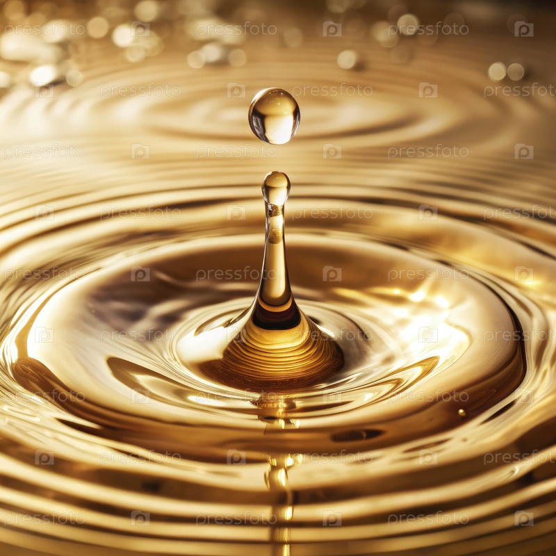 Золотая капля воды создает всплески на спокойной поверхности жидкости
