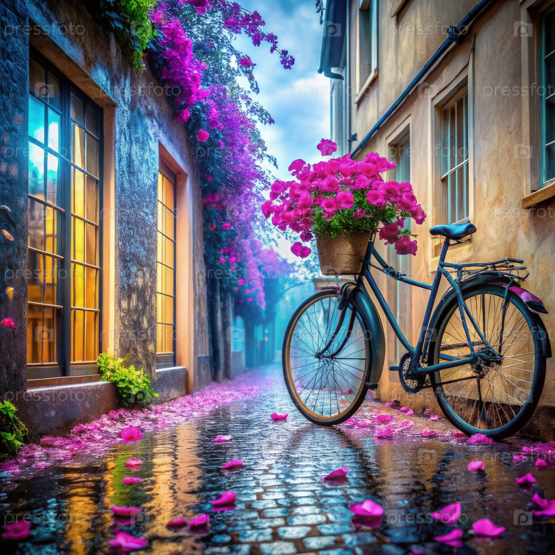 Спокойный утренний дождь на мощеной улице, украшенной яркими цветами