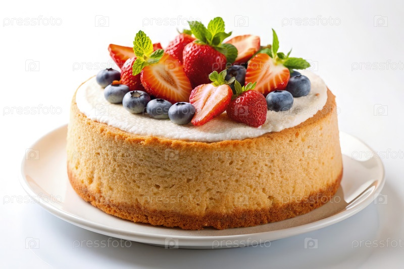 Вкусный пирог с ангельской едой, покрытый свежими клубниками, черники и мятой на белом фоне